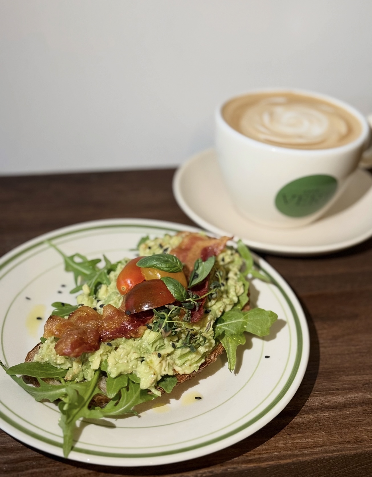 | Avo on toast Ristet surdejsbrød med ruccola, smashed avocado, sort sesam, sprød bacon, tomat og hjemmedyrket krydderurter |