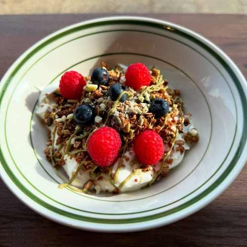 | Græsk yoghurt med pistacie Græsk yoghurt toppet m. hjemmelavet granola m. pistaciekerner, friske bær, pistaciecreme og hvid chokolade |