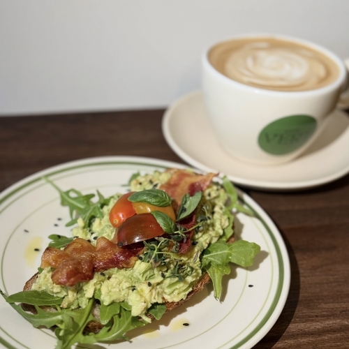 | Avo on toast Ristet surdejsbrød med ruccola, smashed avocado, sort sesam, sprød bacon, tomat og hjemmedyrket krydderurter |
